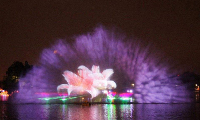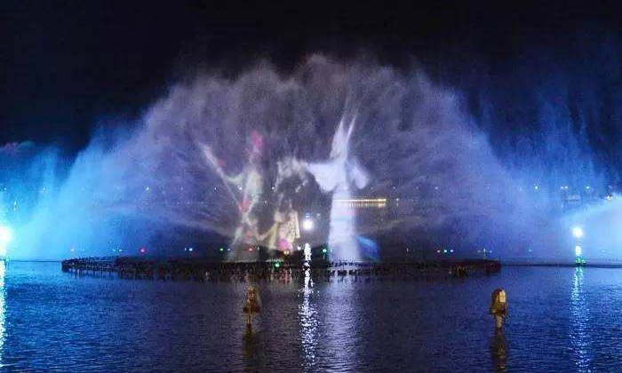水幕电影全称激光水幕电影,是通过高压水泵和特制水幕发生器,将水自下而上,高速喷出,雾化后形成扇形“银幕”,由专用放映机将特制的录影带投射在“银幕”上,形成水幕电影。当观众在观摩电影时,扇形水幕与自然夜空融为一体,当人物出入画面时,好似人物腾起飞向天空或自天而降,产生一种虚无缥缈和梦幻的感觉,令人神往。